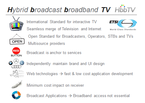 Hybrid broadcast broadband TV (or “HbbTV”) is a global initiative aimed at harmonizing the broadcast and broadband delivery of entertainment services to consumers through connected TVs, set‐top boxes and multiscreen devices. The HbbTV specification is developed by industry leaders to improve the video user experience for consumers by enabling innovative, interactive services over broadcast and broadband networks. The specification uses elements of existing specifications from other standards including OIPF, CEA, DVB, MPEG-DASH and W3C.